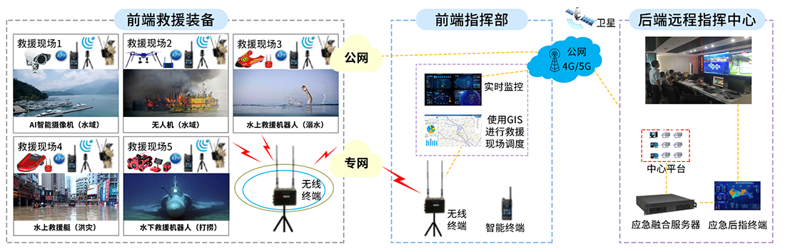 海事管理系統(tǒng)是自主研發(fā)的一套集后端遠(yuǎn)程指揮中心、前端指揮部及前端救援裝備于一體的水域救援系統(tǒng)。后端指揮中心應(yīng)急指揮平臺(tái)分級(jí)管理及調(diào)度,前方救援現(xiàn)場數(shù)據(jù)的上傳并及時(shí)進(jìn)行指令的下達(dá),從而提高決策效率和救援效率。所有前端智能設(shè)備均與前端指揮部及后端指揮中心通過無線進(jìn)行通信,前端遠(yuǎn)程指揮中心根據(jù)其所接收的智能設(shè)備數(shù)據(jù)統(tǒng)一進(jìn)行調(diào)度,指揮救援工作有序進(jìn)行。